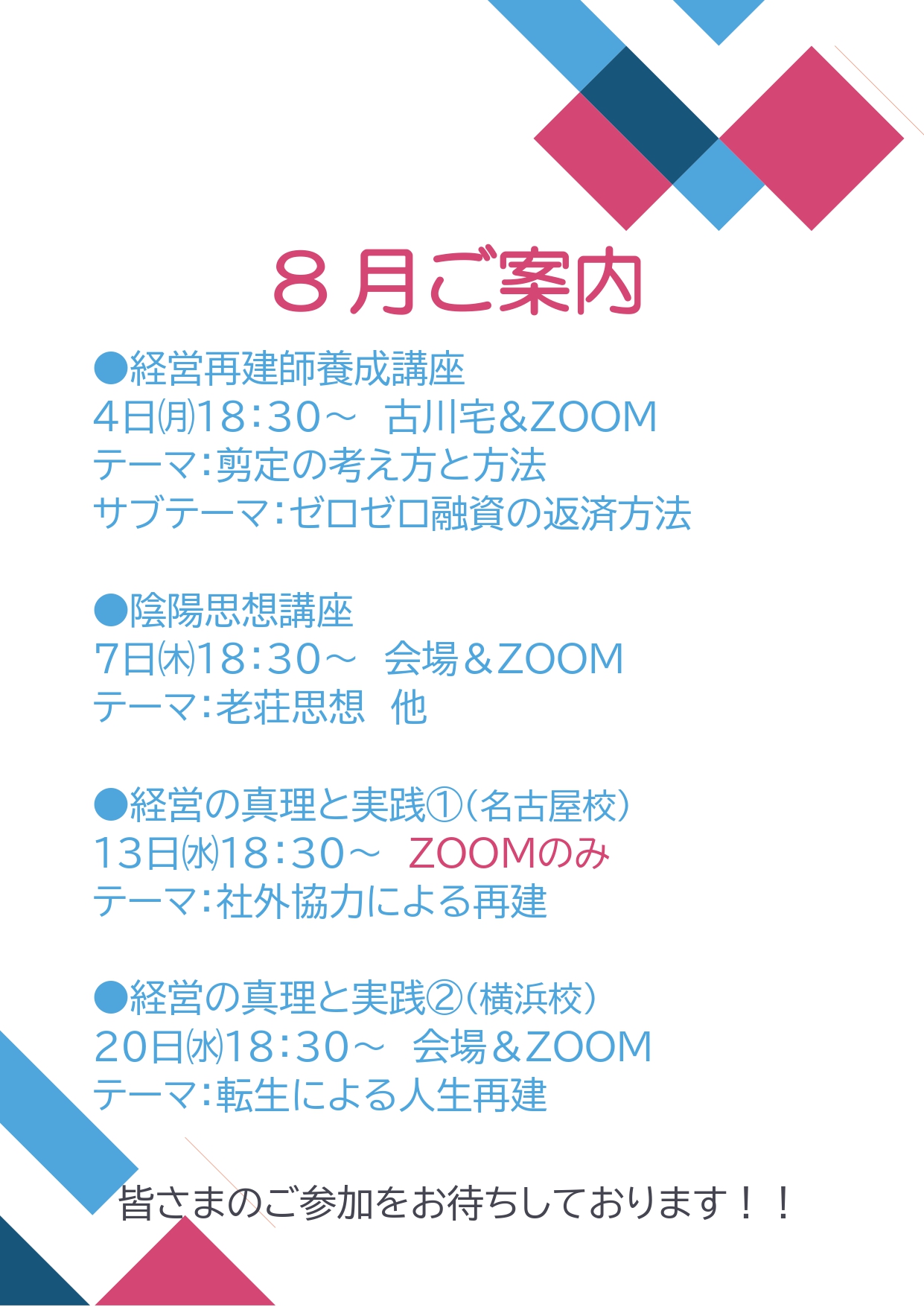 8月も内容の濃い学びをご用意しております。